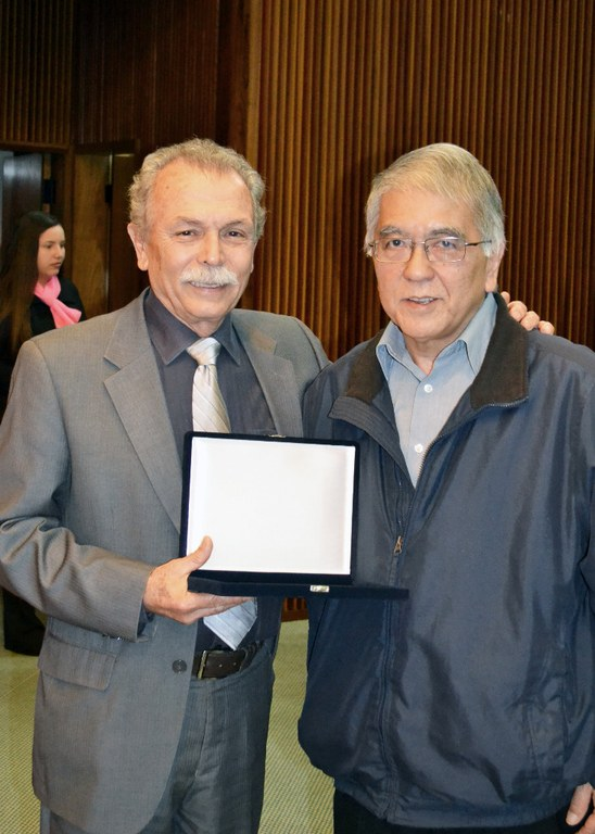 Yosio Shimabukuro (à direita), pioneiro no uso de satélites no combate ao desmatamento, ao lado de Ricardo Galvão durante homenagem no Inpe. Foto: Vanderlim Bastos/INPE.