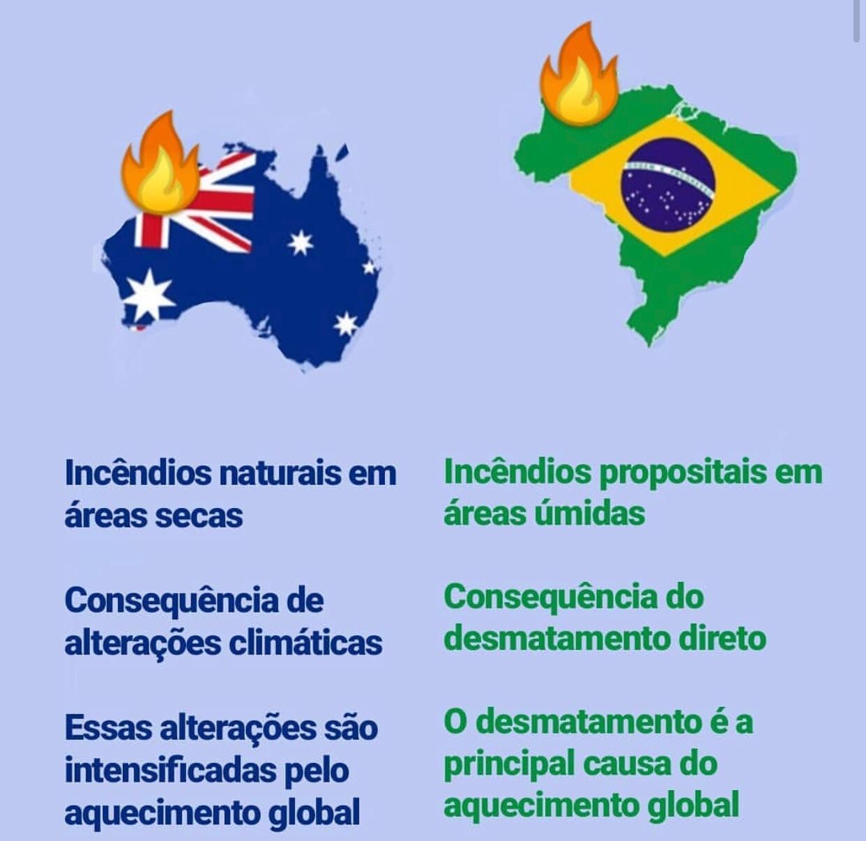 Diferente do Brasil, a maioria dos incêndios na Austrália são provocados por causas naturais, surgindo da combinação de temperaturas acima dos 40 graus, ventos fortes e tempo muito seco. Lá, os incêndios são comuns e acontecem todos os anos. Porém, a situação tem ficado mais complicada com o passar dos anos, devido ao efeito direto das mudanças climáticas do aquecimento global.